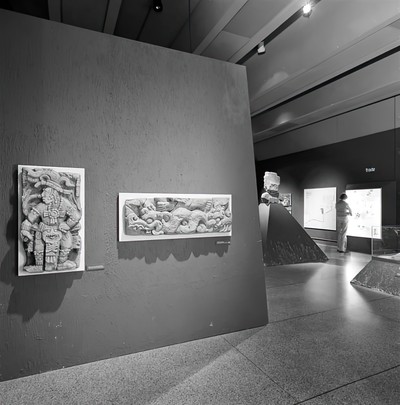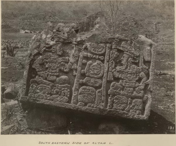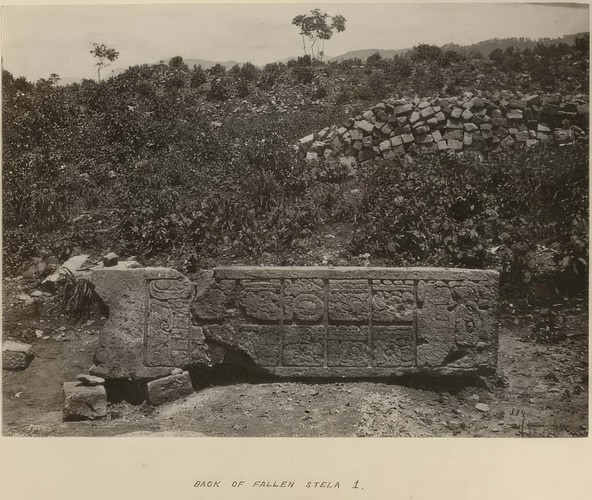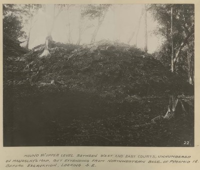 Copan Album: Volume 4, Page 15; Written on page: "Tomb 2. Showing roof stones and chamber. Looking S.W. / after excavation. Beautiful vase decorated with two quet- / zals and hieroglyphs, found with skeleton."