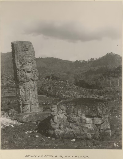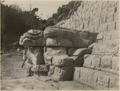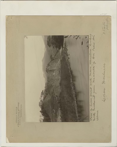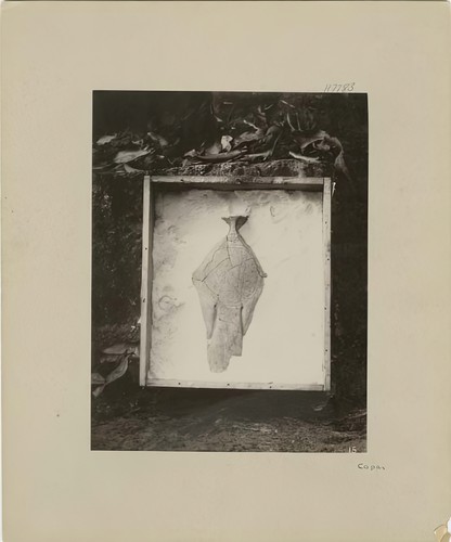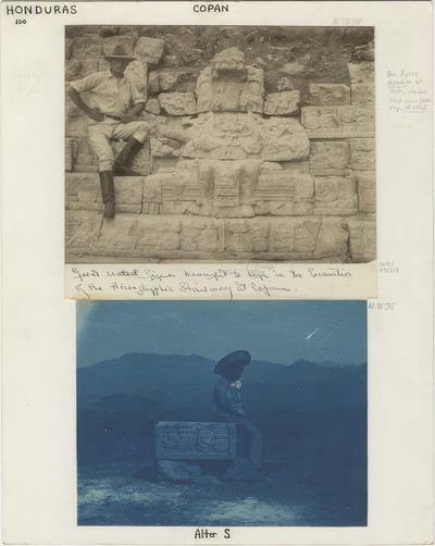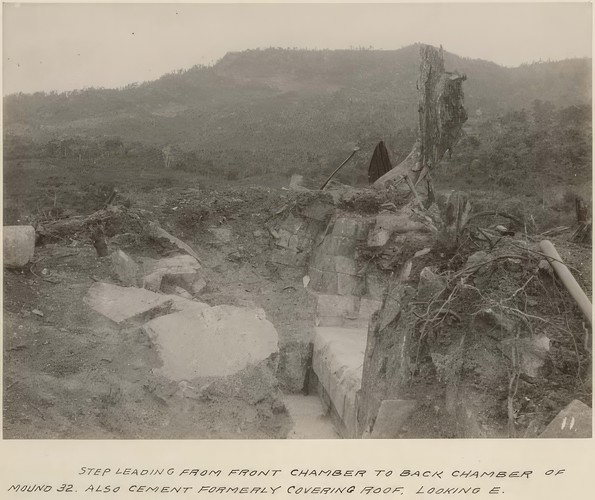 Copan Album: Volume 4, Page 18; Written on page: "Mound north of Plaza Grande in which tomb 3 was / found, looking north, before excavation and showing entrance / to tomb which was opened at some former time by removing / roof stone near eastern end. This tomb was probably below / steps leading up to building. Mound given on Maudslay's map at / extreme northern part with a small mound at E. and W. ends."