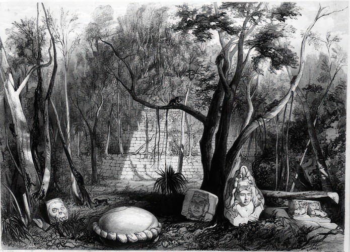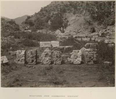 Copan Album: Volume 8, Page 6; Written on page: "Stela 4 looking north showing excavation made by someone in 1893 / and vault opened beneath stela."