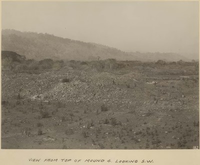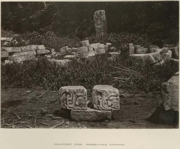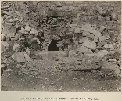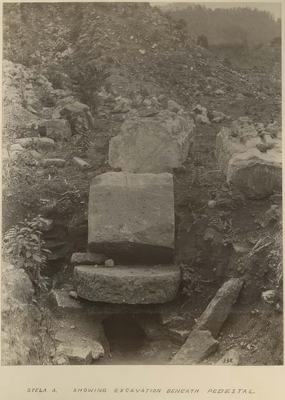 Copan Album: Volume 11, Page 36; Written on page: "Eastern 'Piedra Pintada.' Fallen and broken Stela on isolated point / on hill east of ruins. Looking N.W. Stela 12"