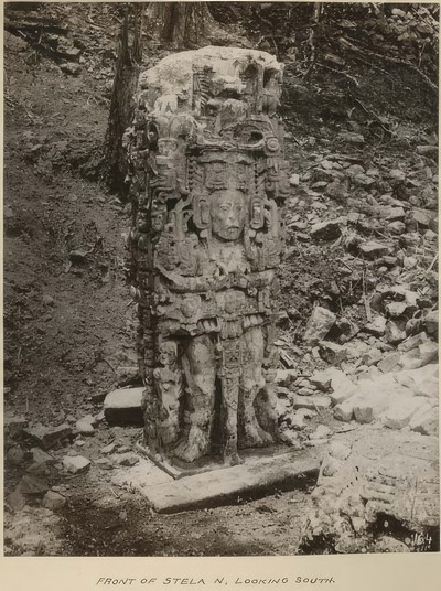 Written on board: Southern side of Stela 1. / found fallen and set up by previous expedition / Mound complete (lower part of this side destroyed) / Copan. / See memoir No. 1 page 39