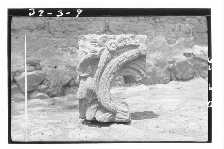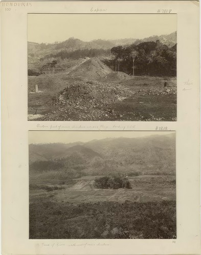 Written on board: Copan / Altar in front of Stela 4. / Fallen Stela 4, in background.