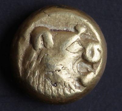 Electrum coin of one-twelfth stater weight (Ephesus Excavations Inventory ART 86/L567). Obverse: roaring lion head facing right, with a round “wart” on top of the muzzle; the wisps of the mane pointing downwards. Reverse: incuse punch. Diameter 0.0073 m; weight 1.1 g.
