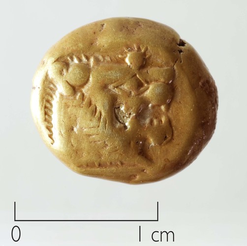 Lamp in the form of a lion, striding forward and holding a shell-shaped spout in his open mouth. A hole at the top of the mane, covered by a separately made hinged lid, allowed the lamp to be filled. A ring and loop just in front of the filling hole held a chain running back to the tail, which was used to suspend the lamp. A horizontal bar on the left side of the lion must be a means of attaching it to some kind of socket, on a lampstand or other fixture; the modeling on this side is sketchier than on the right, indicating that it was meant to be seen from the side. Patches on the sides mended flaws left when the lamp was cast. Length 0.164 m, height 0.083 m, width 0.04 m.