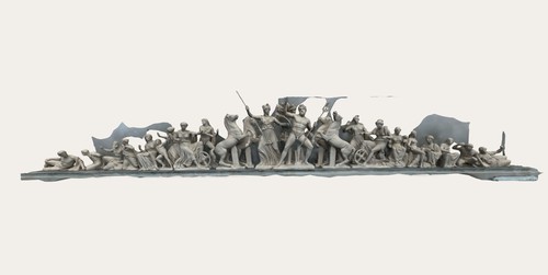 While presently weathered and monochrome due to the ravages of time and environmental exposure, the sculpture was once painted vibrantly. The visual sense of static motion and poise, as well as the interaction between characters, suggests an intriguing narrative element.