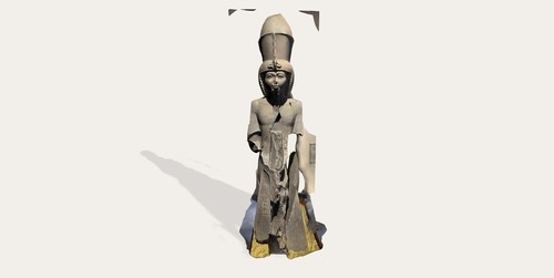 The sculpture also features Sobek, the revered ancient Egyptian deity 'Lord of Faiyum,' denoted distinctively by his crocodile head iconography. Sobek, the god associated with fertility, military power, and the pharaoh's authority, is shown enveloping Amenhotep III's waist protectively. The god's physical manifestation is robust, accentuated by detailed musculature and piercing ocular representation.