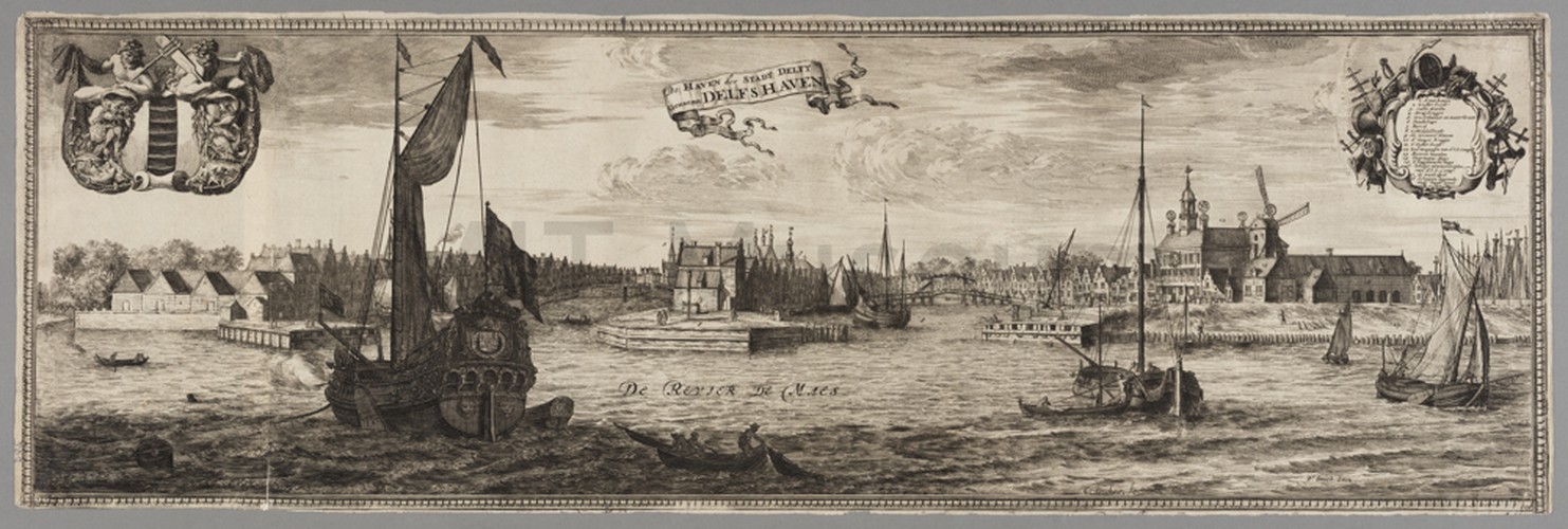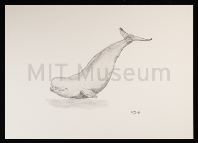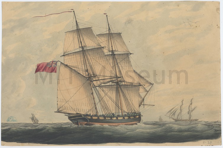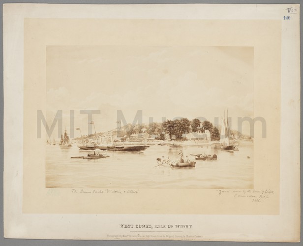Harbour scene showing the small single-masted vessel "Billy-Boy" unloading, with the help of a crane, at a dock. In the background is a beach with several boats dragged up upon it. In the foreground are rocks covered with seaweed. Title and production information printed at base of image.