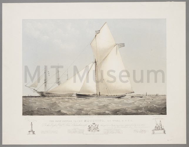 A black-and-white photograph of the square-rigged ketch, 'Bridesmaid,' sailing in open waters. She is viewed at a three-quarter angle from the bow, and men are on her deck. Other sailing vessels are in the right background.