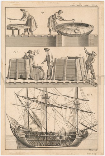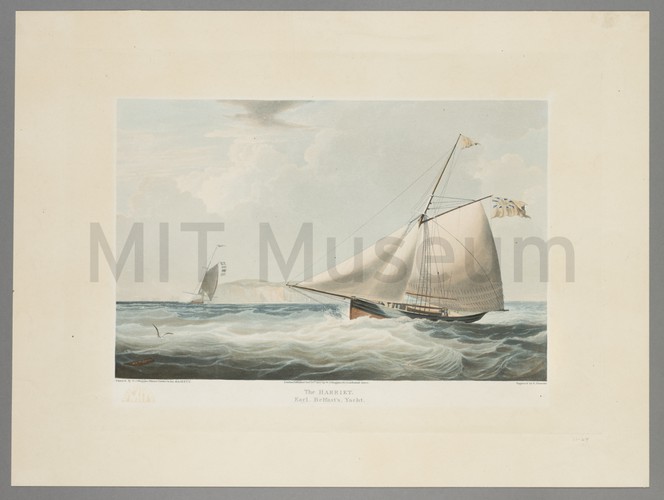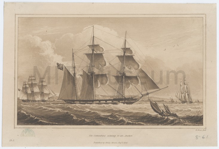 Hand-colored etching depicting a naval battle between two vessels seen in side view. Front and left, the French ship "La Guerri̬re", her foremast snapped, flying the French flag; behind and to the right, the British frigate "Blanche", flying the British naval jack. The Union Jack in the canton has been poorly and splotchily rendered by the colorist.