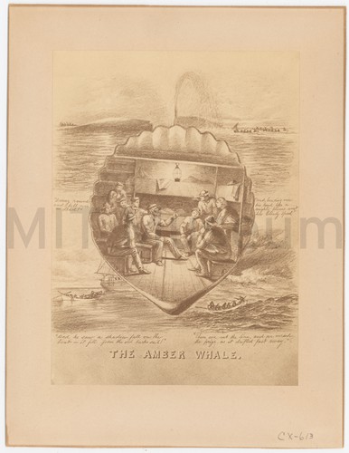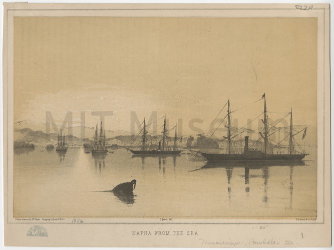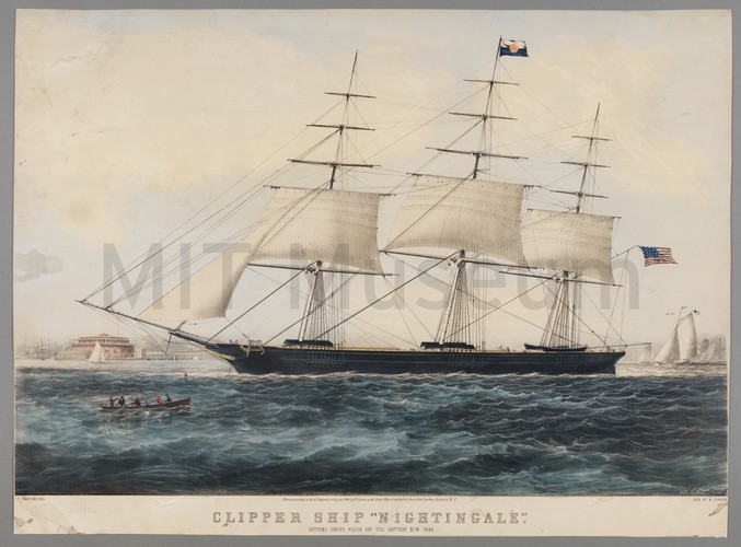 Tinted lithograph depicitng a schooner at sea, with other vessels and a landmass in the background. Title and production information printed in lower margin.