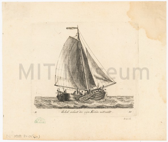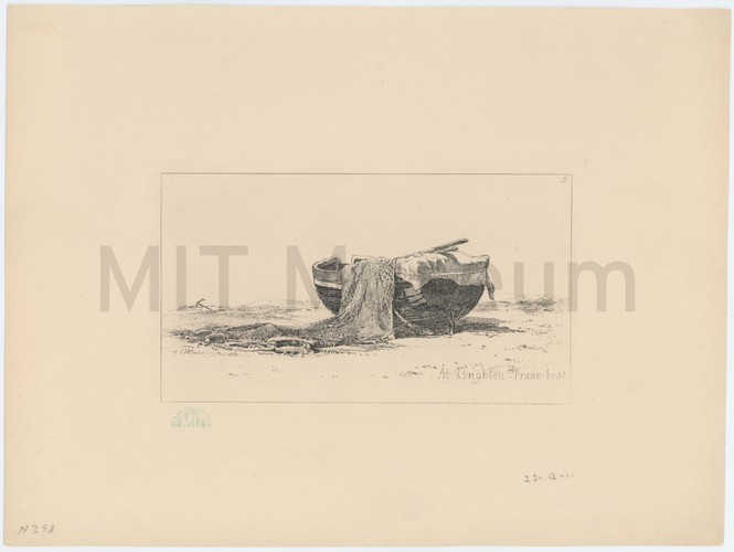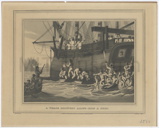 A black-and-white photo-processed reproduction of the painting or print of the HMS Brigantine "Dolphin" docked in a harbor. Four men pull in a fishing net in the foreground. The brigantine "Dolphin" was part of the British Royal Navy and played a role in combatting the slave trade.