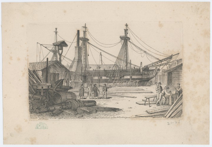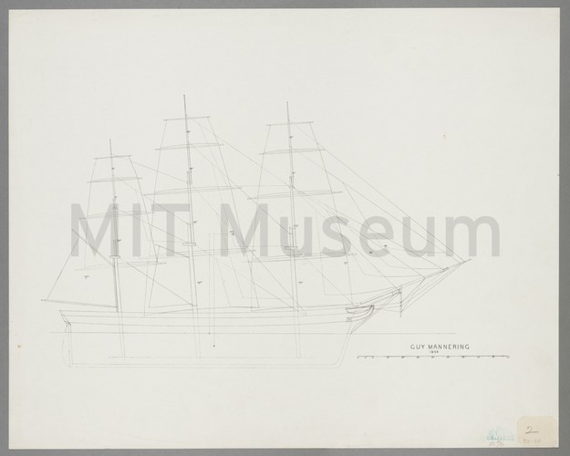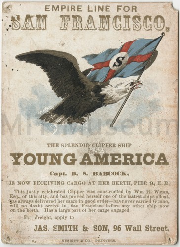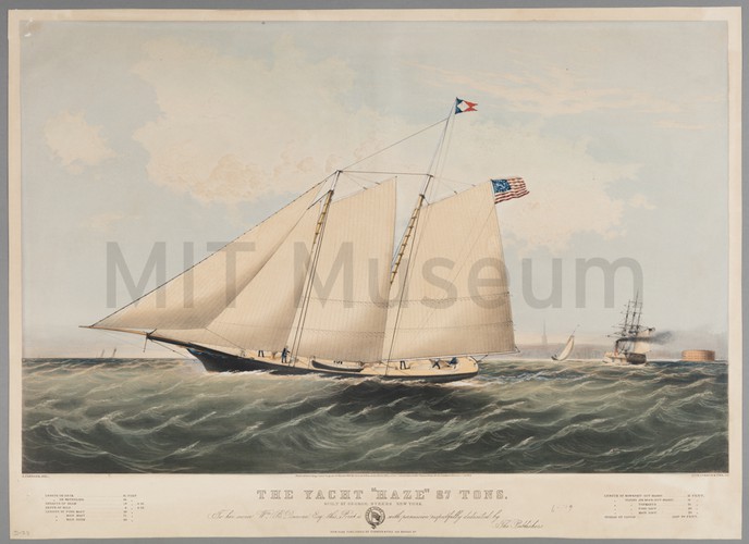 Photograph of a print in very poor condition, with soiling, creasing, and numerous tears. Print depicts, in side view, the steamer "Great Western" at sea, with two sailing ships in the background. The title and publisher information is printed on the lower margin. Some pen inscriptions appear atop the masts of the steamer, on the print.