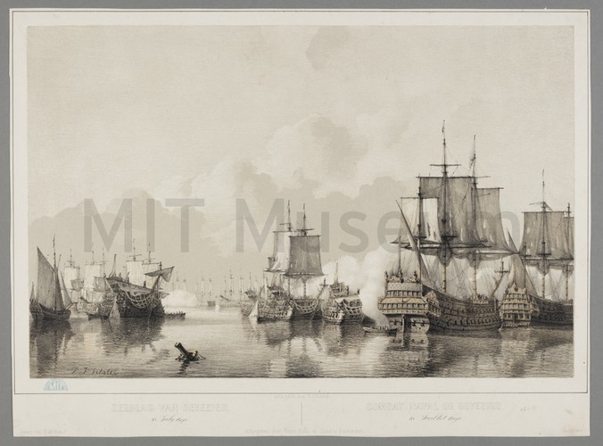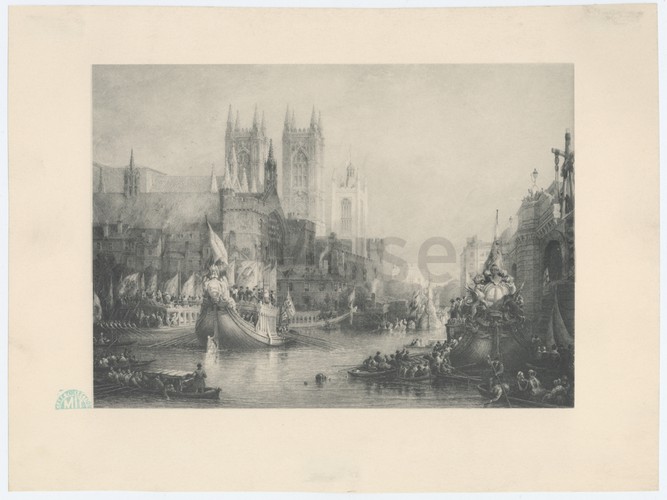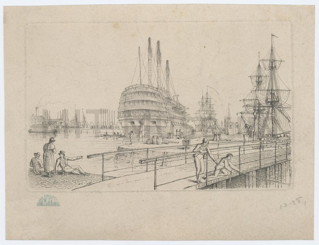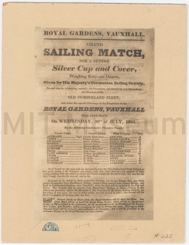 Piece of a paper lampshade with a lithograph of the ship Niagra on the water near a shore. Pencil note in lower margin identifies the vessel.