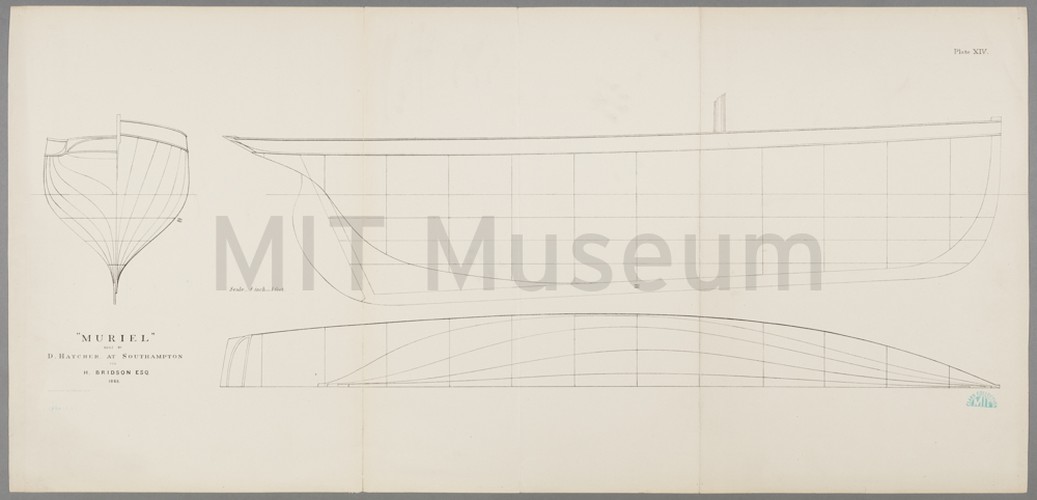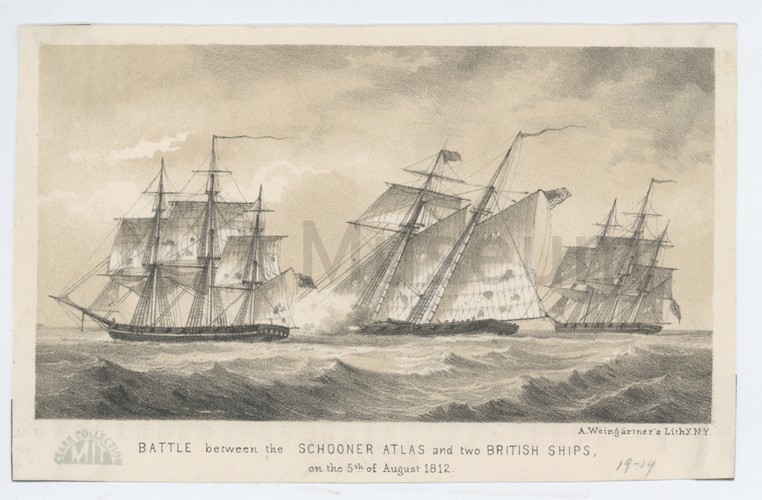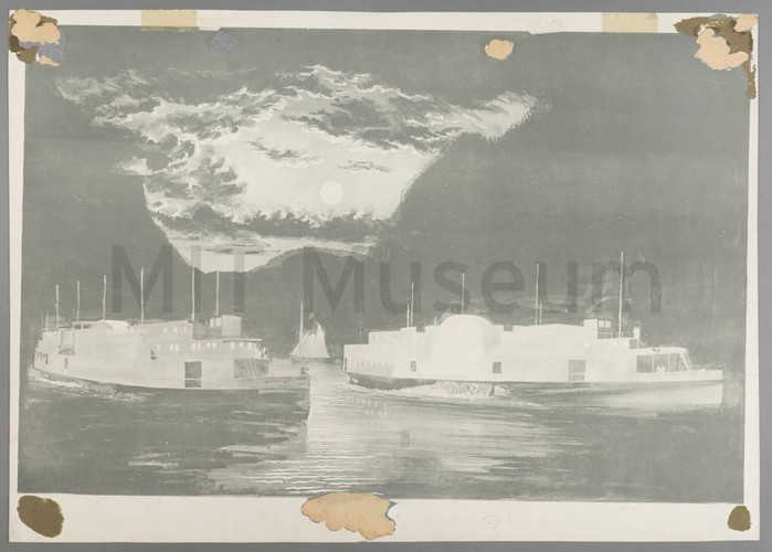 Photograph of a painting depicting the ship "Sappho" at sea off Sandy Horn, with other vessels in the background. Title and date of original painting written in pencil in margin.