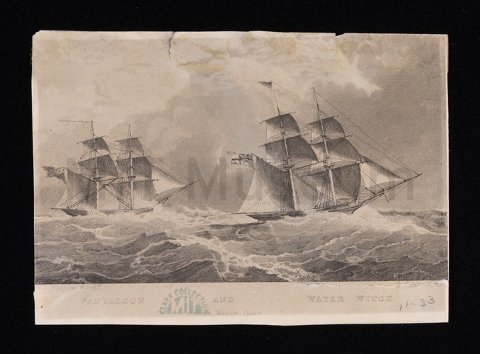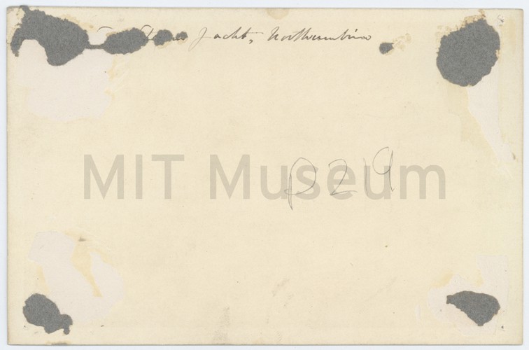 Two parts: image and cut-out label. A copy of Thomas Goldworth Dutton's painting made through photo-processing. The black and white ship portrait of the the 47 tons cutter yacht. Represented under a treble-teefed mainsail, double-reefed fore-sail, reefed bowspirit, and third jib with topmast sent down on deck, topmast gear all unrove and stowed away, topmast stay seized to the mast-head cap, and a flag flying from an iron spindle driven firm into the mast-head.