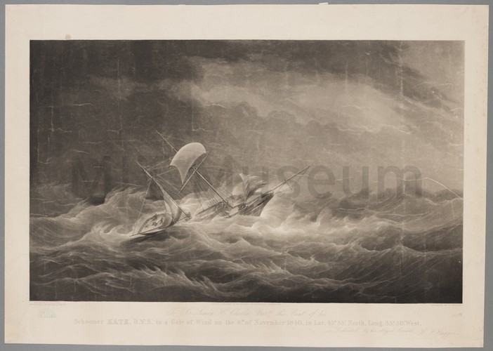 Photograph of a painting depicting the frigate "Trafalgar" at sea. Mounted on board. Title from inscription on lower margin of board.