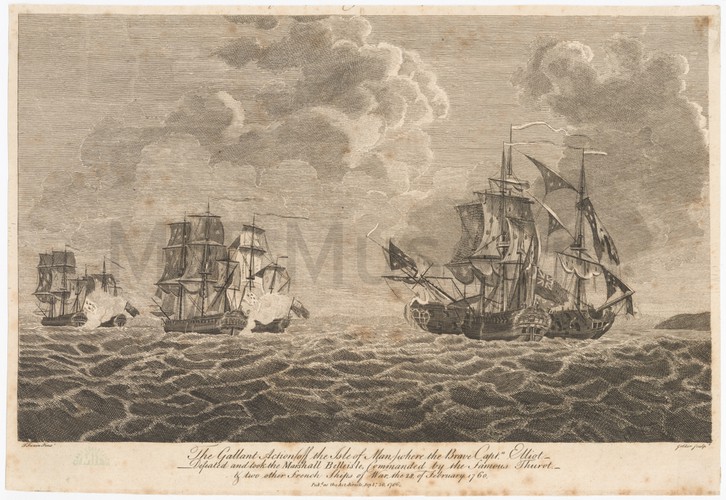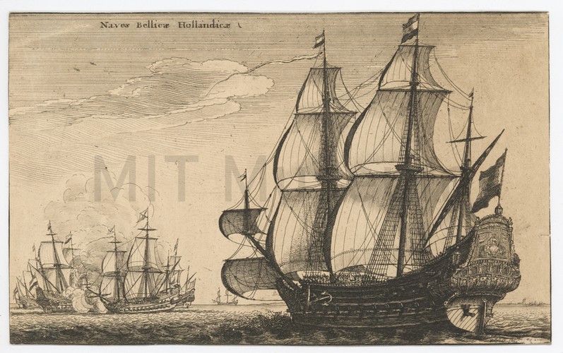 Etching depicting a view of ships moored at a harbor at right, including a yacht flying the Dutch flag. More vessels and a distant landmass are seen in the left background, and a rowboat with four figures in the left foreground. With "G. Groenewegen" printed in lower margin.