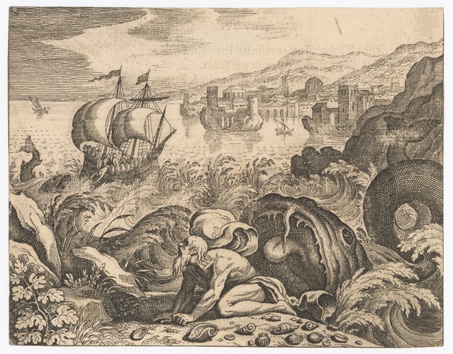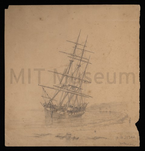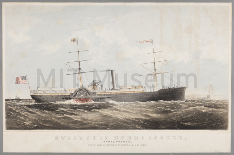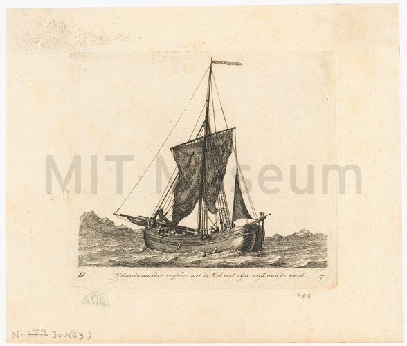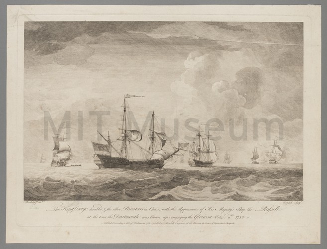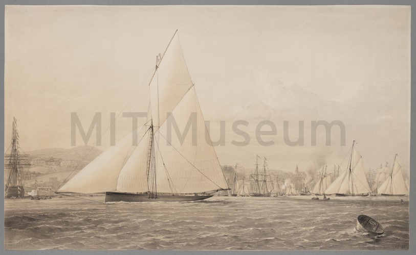 Print on rice paper depicting a side view of a spouting whale with ridges on its back in a harbor. Spectators in boats--both long whaleboat-like vessels and covered passenger boats--populate the foreground; at the bottom right corner, roofs and houses, including a balcony with two men peering through a telescope, are visible. Artist's signature is in a red box at bottom left. In the background are single-masted vessels, the open sea, and a mountainous shore at right. At top right is the title of the image in kanji characters, translating to "A treasure to put into the treasury of a bountiful year".