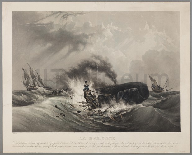 Colored engraving showing the Garden of Eden. Many land animals are in the foreground. In the background, a nude figure stands on a rock over the water, pointing in different directions with each hand. There is a spouting whale near him. Text reads, "Adam Naming the Creation."