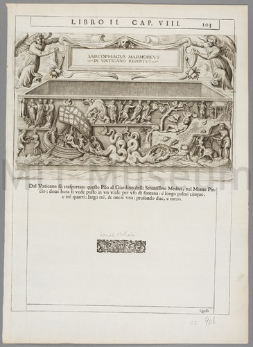 Hand-colored engraving depicting a beached male cachelot, side view, surrounded by spectators. The sea crashes on the beach in the background. At right, a man seated on a barrel is making a sketch of the animal. The artist information and title are printed in the lower margin, and specify that "J. Augustini ad viv del" (drew this from life); perhaps the artist in the image is a self-reference by Augustini. The title, "Af tekening van een Cachelot den 20 Feb. 1762 tussen Zandvoort en Wykip Zee, aan strand Gedreeven, groot 61 voet 6 duum", translates to "A picture of a Cachelot, driven onto the beach between Zandvoort and Wykip Zee on 20 Feb. 1762, length 61 feet 6 inches."