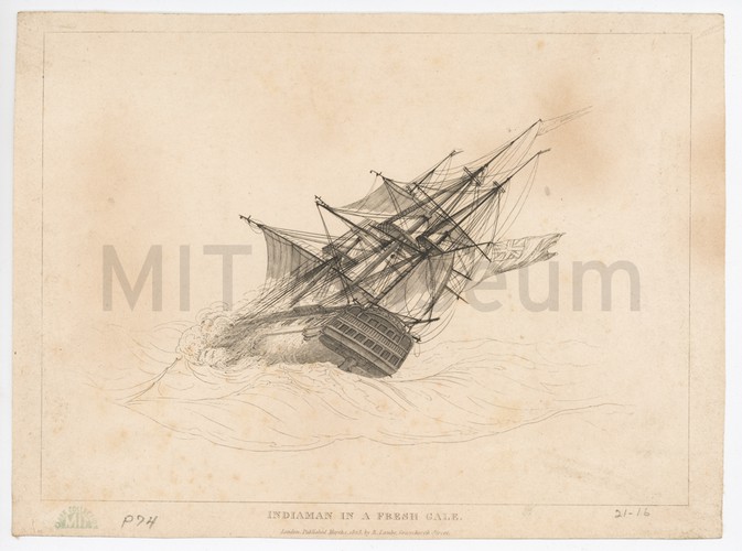 This woodblock print shows an American sail/steam vessel off the port of Yokohama; Japan on April 1861. It is inscribed; 'Amerika Jokisen: Nagasa Yonjukken Habe Rokken' Published by Maruya Jinpachi. It is a highly stylized Japanese impression of a western vessel.