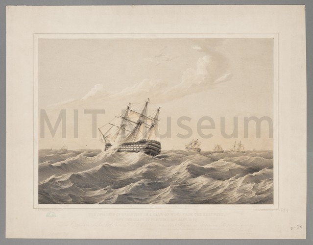 Hand-colored lithograph depicting a ship between the crests of two waves on a stormy Antarctic sea. Another tilting pair of masts are visible in the background, as well as numerous icebergs. The title and publisher information, including Currier's address "152 Nassau St. New York", are printed in the lower margin.