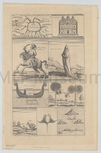 Black and white engraving of a collection of antiques. Objects are numbered and a key at bottom identifies each piece. The largest object, which takes prominence in the print, is a menorah. The text at bottom identifies it as the menorah from the Temple in Jerusalem, to which the romans have added an additional base after the "triumph of Titus." ("Candelabro del Tempio di Gerosolima la base aggiuntavi dai Romani per il trionfo de Tito, si vedi nel medemo Arco.") The base of the menorah is decorated with seahorses, whales and dolphins.