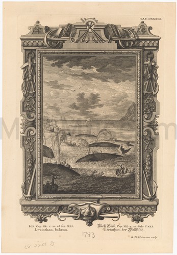Printed star chart with a printed blue ink border and central constellation hand-colored. Both the component stars and the figural representations of the constellations are given. Star names given in Arabic, but in Latin alphabet. Title of series, "The Heavens Illustrated", and the plate number, in top margin; title of image "Aries- the Ram", printed in lower margin. Artist attribution in lower right corner of star chart. Cetus visible below Aries.