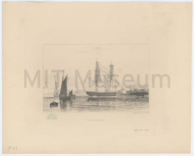 Woodcut from Ballou's Pictorial Drawing-Room Companion, January 5, 1856. The image depicts pituresque illustration of the Aurora Borealis (northern lights) in the arctic. It features tremendous ice peaks rising on every hand, reflecting the light of the sky; the still bay and freezing waters; two walruses; a plunging whale; and ships lying quietly at anchor.