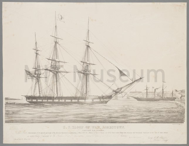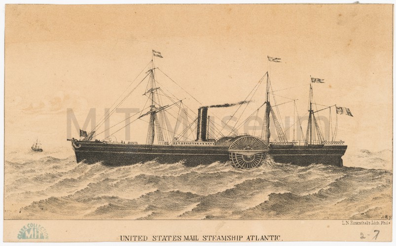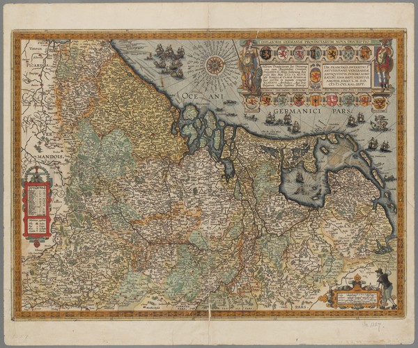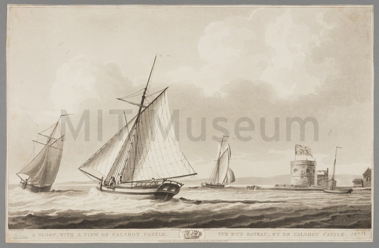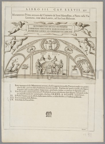 Hand-colored engraving, optical, depicting men in whaleboats bringing dead whales back to the ships of a whaling fleet. Icebergs in the background. Title is given in Latin and French in the lower margin; in English, it translates to "The whale is brought to the ship." At bottom left is printed "Cc 3."