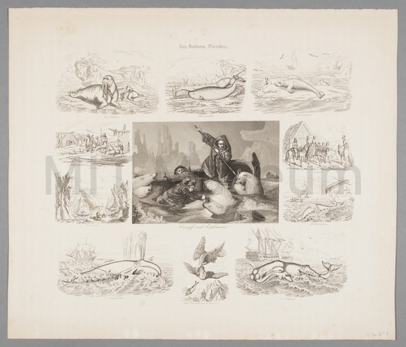 Page 686 (verso 685) from the book "De cetis" (Liber 1) by Ulyssis Aldrovandi, first edition (1613). Hand-colored. Depicts part of a whale. Verso also depicts what appears to be a ring of bone or baleen from a whale. With text in Latin.