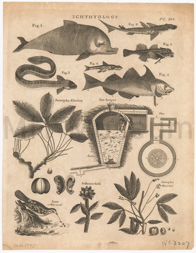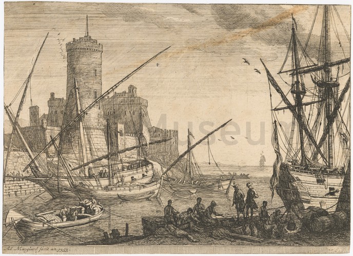 Engraving depicting several small two-masted boats sailing off a coast, with a man sitting on the rocks in the foreground and fishing. Title, artist attribution, and number of print in sequence printed in lower margin.