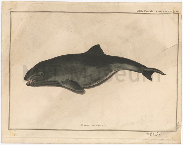 Engraving depicting a shallop, in side view, with a man standing on the prow and aising a harpoon to strike a stylized whale, at left. Another shallop and whale are visible in the background at right, with a rocky or icy coast behind them; in the backgroun at right is a ship. Title, number of print in sequence, and artist attribution printed in the lower margin.