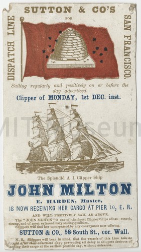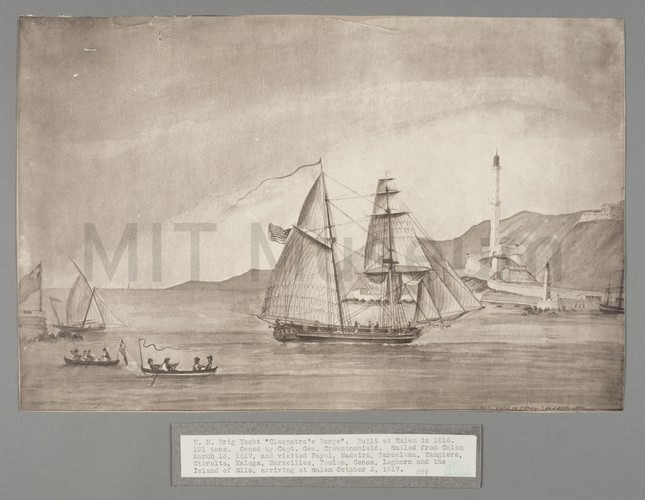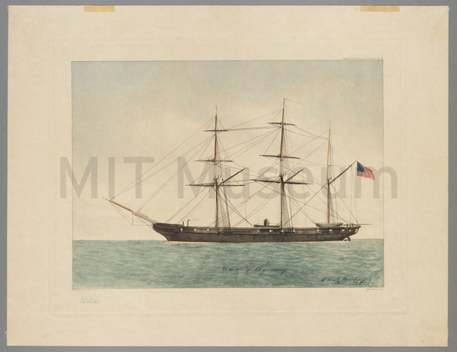 Side view ship portrait of a two-masted ship flying the American flag sailing towards a harbor, at right, with tall towers and a winding white wall. Other vessels in the foreground at left. Title printed below the image. Appears to be a printed reproduction of an earlier work.