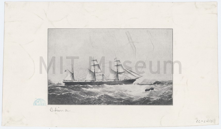 Sepia photo-process print of a lithograph. Port-side view of clipper ship with furled sails.