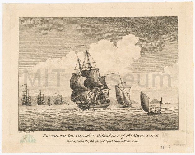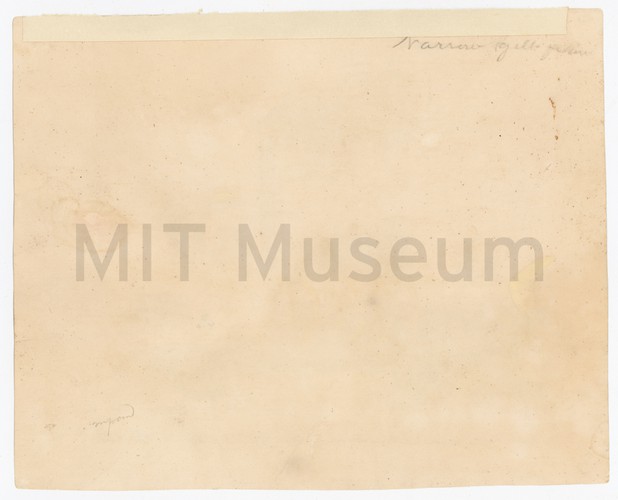 Photo-processed print of an unidentified painting of the American clipper ship, 'Archer.' She is anchored in a harbor near mountainous land and flies signals.