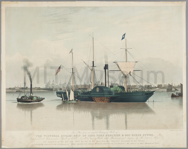 An uncolored, port-side view of the clipper ship 'Great Republic.' All her sails are full and set. A clipper heads towards her in the left background; another clipper ship and steamship sail in the distant horizon. The 'Great Republic' was noteworthy as she was the largest wooden clipper ever constructed. On 27 December 1853, a fire broke out and she was burnt to near the waterline ("water's edge"). She was eventually salvaged and rebuilt with reduced masts.