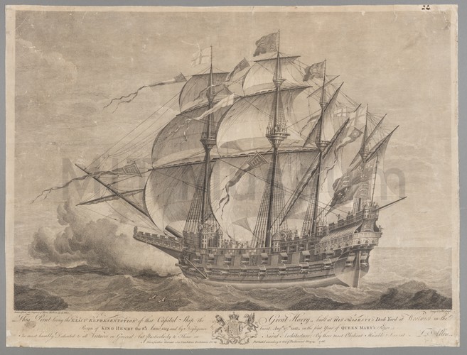 A copperplate engraving from the book titled, 'Plan de plusieurs b̢timens de mer avec leurs proportions dedi̩ �� Son Altesse Serenissime Monseigneur Louis Auguste de Bourbon' (Marseille: c. 1720) by the French Captain Henri Sbonski de Passebon. The book was a collection of naval architecture prints. This print is a section view of a standard late 17th century French galley (gal̬re, Fr.) with a detailed legend of parts (in French). Below the galley is a representation of the keel-form at the shipyard on which the keel was apparently built up.
