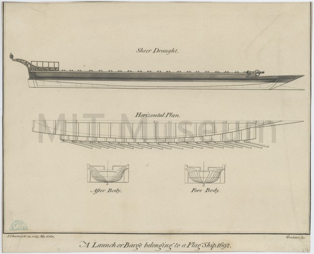 A copperplate engraving from the book titled, 'Plan de plusieurs b̢timens de mer avec leurs proportions dedi̩ �� Son Altesse Serenissime Monseigneur Louis Auguste de Bourbon' (Marseille: c. 1720) by the French Captain Henri Sbonski de Passebon. The book was a collection of naval architecture prints. This print is a section view of a French, 104-gun frigate. Each part of the ship is labeled with a letter, number, or symbol that corresponds to the letter, number, or symbol with the name of the ship's part.
