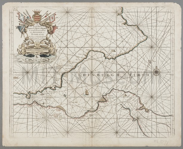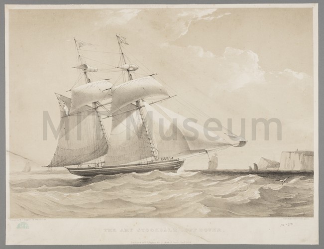 Print after a Samuel Walters painting of the mail steamer, "S.S. Parthia" (later "Victoria"). The ship is seen in side view, with a lighthouse in the background at left. Title, artist name, and the word "REGISTERED" printed in lower margin.