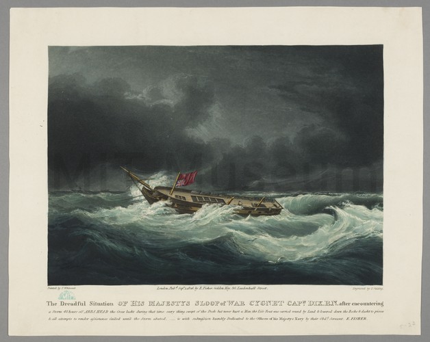 A colored lithograph of the starboard-side view of the cutter yacht 'Bianca.' Men haul rope, look through a spyglass, and steer the rudder on deck. A two-masted vessel with square sails and a cutter is in the left and right background respectively. The dedication, dimensions, and a list of "Performances on the Delaware" are inscribed in the bottom margin.