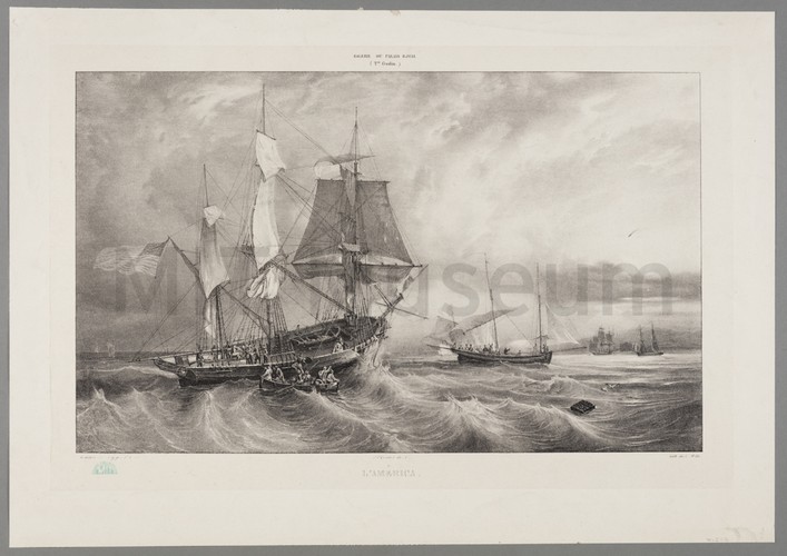 Colored engraving of a small settlement by the water's edge, built on a rise. The houses have white walls and red roofs and are low to the ground. A Danish flag is flying on a hill. A road with a simple gate at the water's edge leads up from the water to the hill, and there are several boats in the water. Artist signature in bottom right corner. Title is printed under the image.