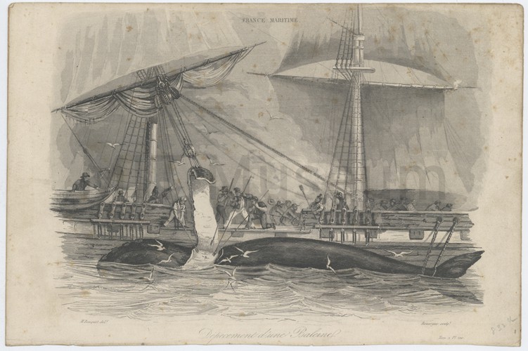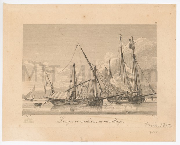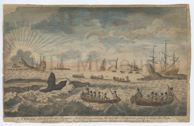 A scene of a fleet of Dutch herring buss (buis') fishing in the North Sea. The herring buss was a specially designed fishing boat with an onboard processing "factory" that made it highly suitable for long periods away from home. The print shows how the Dutch caught herring by casting out drift nets into the open sea. Men in small boats assist the larger boats in the foreground.