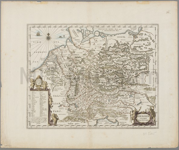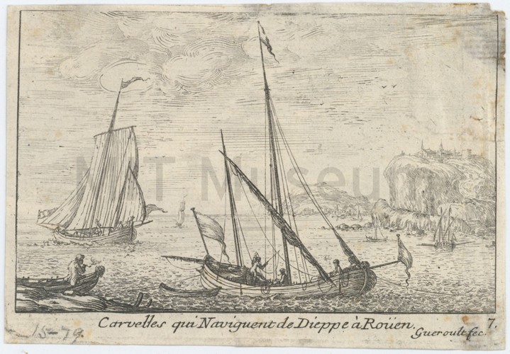 Woodcut depicting a side view of a bireme (galley with two tiers of oars), with two men, who are out of scale with the vessel, within. Another woodcut of a galley, this one empty, on verso. Cut from a page of "De Re Navale", a book on Greek and Roman naval architecture.