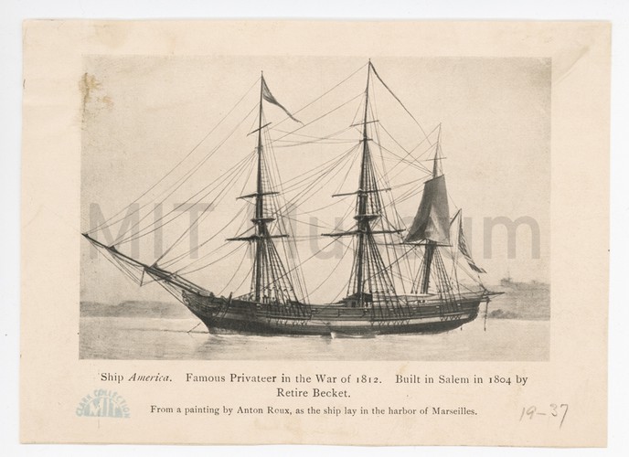 Woodcut depicting a side view of a high-prow boat, with a bearded man, his hair being blown in opposing directions, rowing it. The rendering of the water following the oar give the impression that he is rowing through a highly viscous medium. Clipped from the 1541 book "De Re Navali", about Roman and Greek vessels of antiquity. Latin text on verso.