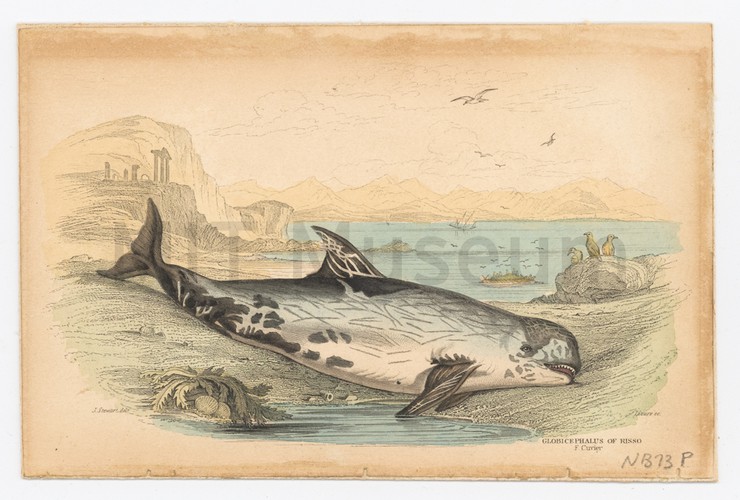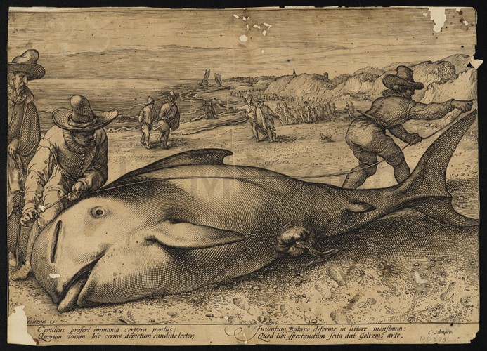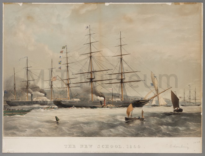 Woodcut depicting a side view of a galley on the water, filled with oarsmen. Latin text on verso. Cut from a page of "De Re Navale", a book on Greek and Roman naval architecture.