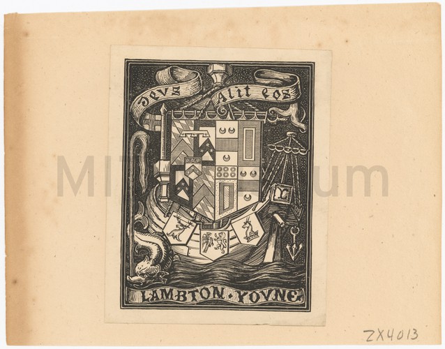Uncolored engraving depicting a sea full of various chimeric monsters, and in the background, in the upper fifth of the image, a shore with various land monsters upon it. Each monster is labeled with a letter.