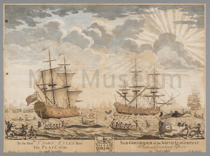 A print depicting a haven, which is a port, harbor, or other sheltered place for shipping, in Delft. Men and women in small boats row across the river or to their ship. Various buildings, a dock, and a windmill are in the background. Perhaps part of the original print before it was trimmed, a loose fragment depicting the Amsterdam crest and its golden lions is a part of this object.