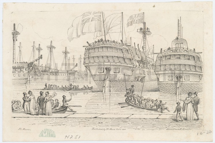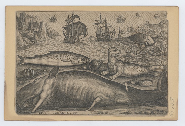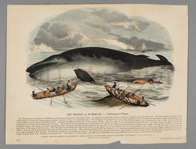Men on a whaleboat about to harpoon a spouting whale. The whaling vessel in the immediate background has a whale fastened to its side and two men are in the process of cutting in. The black smoke from the vessel indicates the tryworks being used. A whaleboat in the center, most right drags carcass back to the main ship.