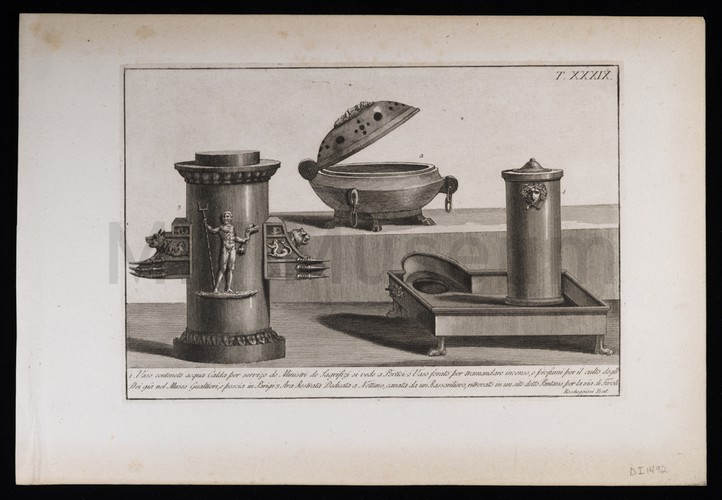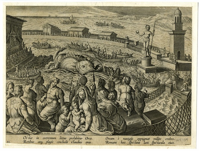 Page 377 from the book "De Roma Sotterranea" ("On Subterranean Rome"), by Antoine Bosio. With an engraving with five subfigures, each depicting a carving from the ancient Christian cemetary of St. Marcellino. Figure A shows a detailed object with five Biblical scenes. Italian text printed above and below describes the figures and notes that the outer four scenes depicted in Fig. A show Noah in the Arc and three scenes of Jonah (III, swallowed by the whale; IV, spat out by the whale; V, under the gourd-tree).